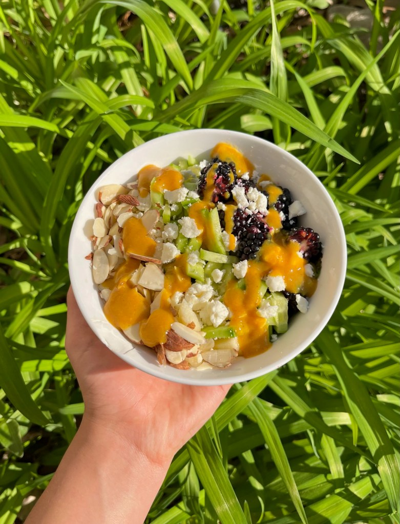 - Assemble the salad by adding your cut fruit and vegetables to the kale, adding almonds and feta, then pouring on the dressing